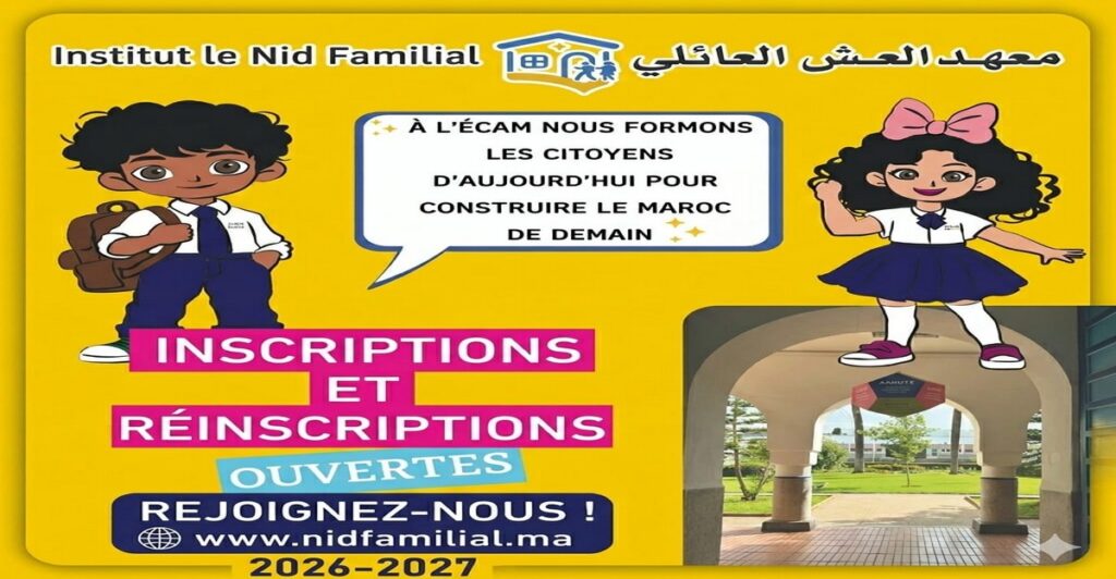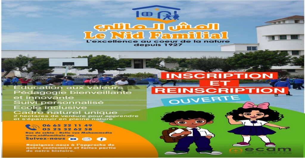 Depuis 1927, l’Institut Le Nid Familial veille à transmettre son héritage et sa philosophie de l’éducation basée sur le projet éducatif de l’ECAM. Situé à Mohammedia, Boulevard Sebta Bellevue, l’institut s’étend sur 2 hectares, comprenant des bâtiments, des cours, des terrains de sport et des espaces verts, offrant ainsi un cadre exceptionnel aux élèves.
